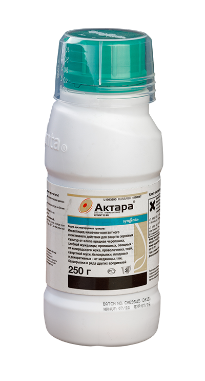 АКТАРА, ВДГ — инсектицид кишечно-контактного действия, предназначен для защиты: картофеля — от проволочника и наземных вредителей; капусты — от капустной мухи; гороха — от тли, зерновки; овощных и цветочных культур закрытого и открытого грунта — от тли, белокрылки, трипсов, щитовок и ложнощитовок; винограда и яблони — от медяниц, цикадок, цветоеда. Инсектицид применяют как для опрыскивания растений в период вегетации, так и для внесения в почву. При внесении в почву обладает выраженной системной активностью.