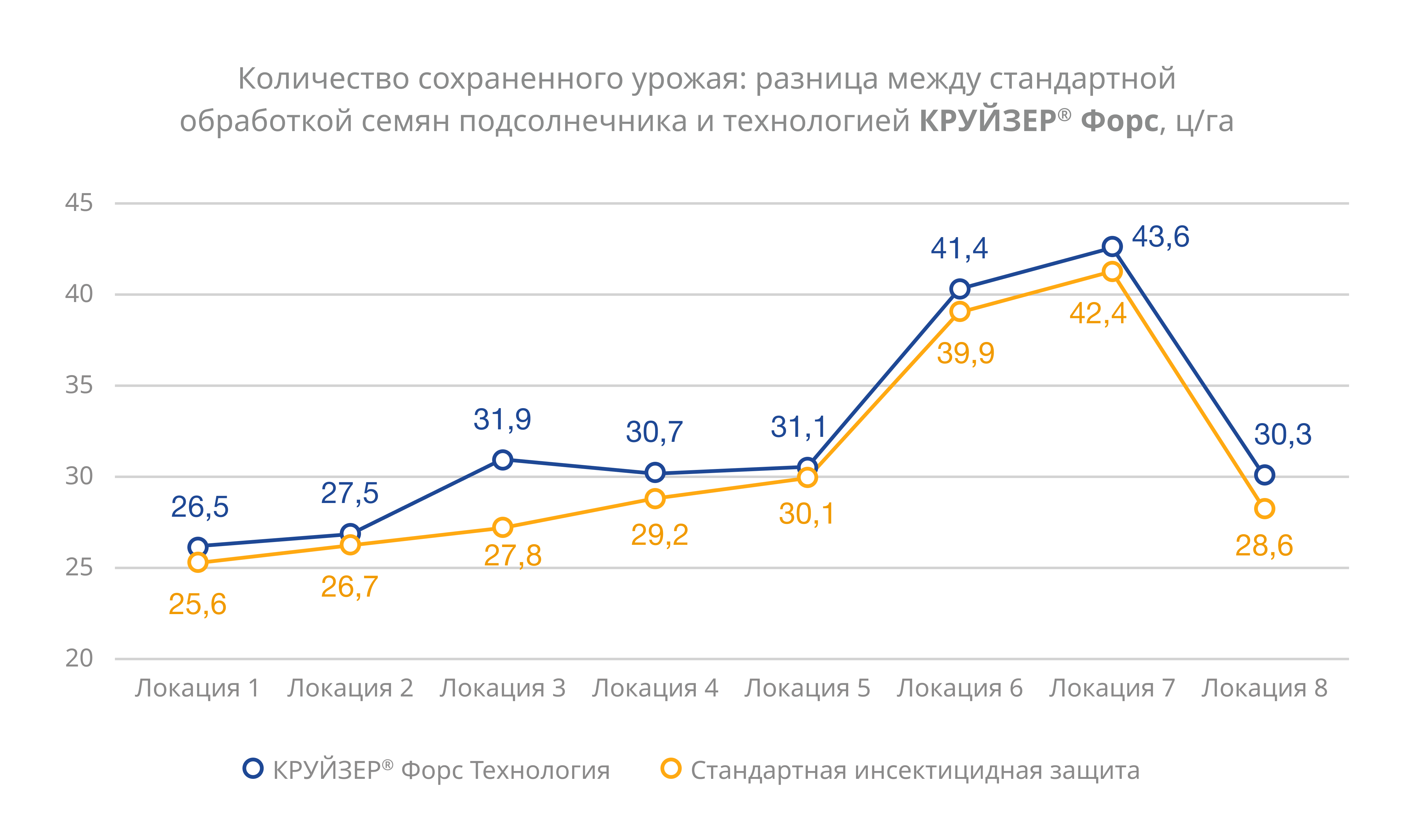 График отражает прибавку урожайности подсолнечника в зависимости от выбранной схемы защиты семян.Система защиты на основе технологии КРУЙЗЕР® Форс сохраняет от 0,86 до 4,08 ц/га урожая по сравнению со стандартными системами инсектицидной защиты семян.